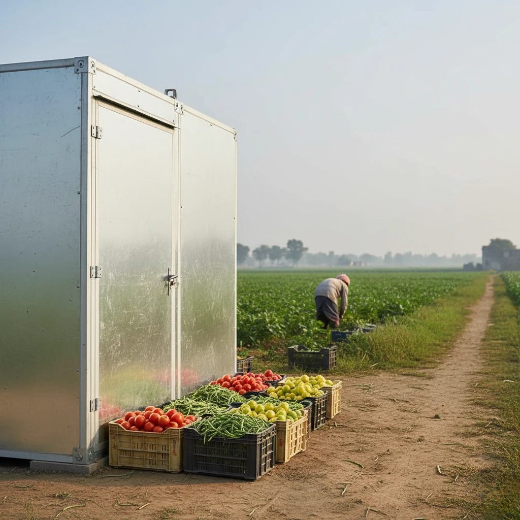 Compact cold storage units installed directly at the farm-gate to prevent first-mile losses.